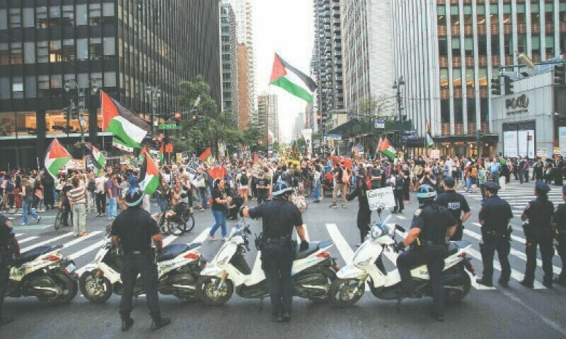 نیو یارک میں اسرائیلی قونصلیٹ کے قریب مظاہرین غزہ میں مظالم کیخلاف احتجاج میں شریک ہیں۔