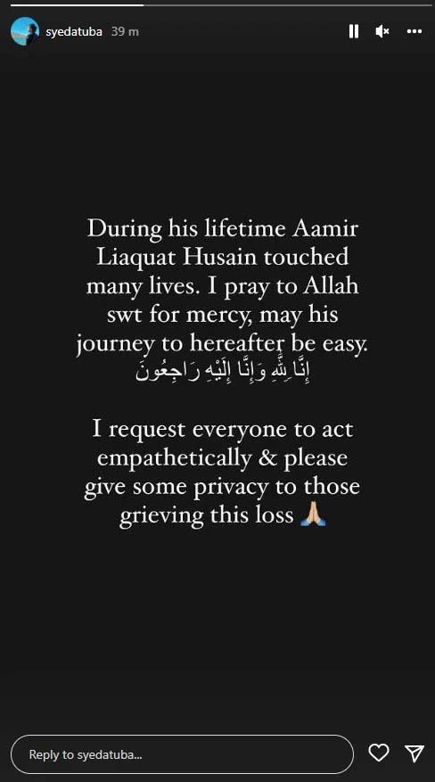 طوبیٰ انور نے اپننے انسٹاگرام اکاؤنٹ پر سٹوری شیئر کرتے ہوئے عامر لیاقت کی وفات پر افسوس کا اظہار کیا اور لکھا کہ اپنی زندگی کے دوران عامر لیاقت نے بہت سی زندگیوں کو متاثر کیا، میری دعا ہے کہ عامر لیاقت حسین کی آگے کی زندگی آسان ہو۔