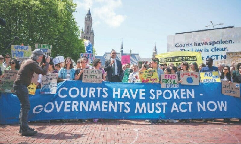 عدالتی فیصلے سے قبل ماحولیاتی انصاف کے حامی دی ہیگ میں عالمی عدالت کے باہر جمع ہوئے اور نعرے لگاتے رہے کہ ہمیں کیا چاہیے؟ ماحولیاتی انصاف! کب چاہیے؟ ابھی!