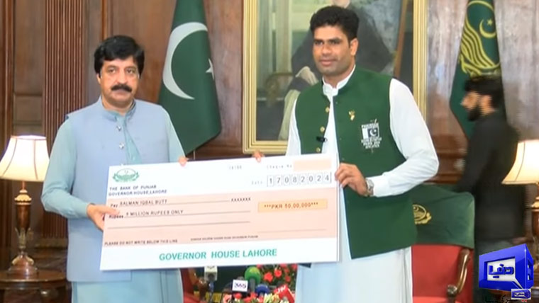 تقریب کے دوران گورنر پنجاب سردار سلیم حیدر نے گولڈمیڈلسٹ ارشد ندیم کو 20 لاکھ روپے کا چیک اور گاڑی کا تحفہ دیا، اس موقع پر سندھ حکومت کی طرف سے کوچ سلمان بٹ کیلئے 50 لاکھ روپے کا چیک پیش کیا گیا جبکہ نجی ہاؤسنگ سوسائٹی کے مالک کی جانب سے ارشد ندیم کو پلاٹ دیا گیا۔